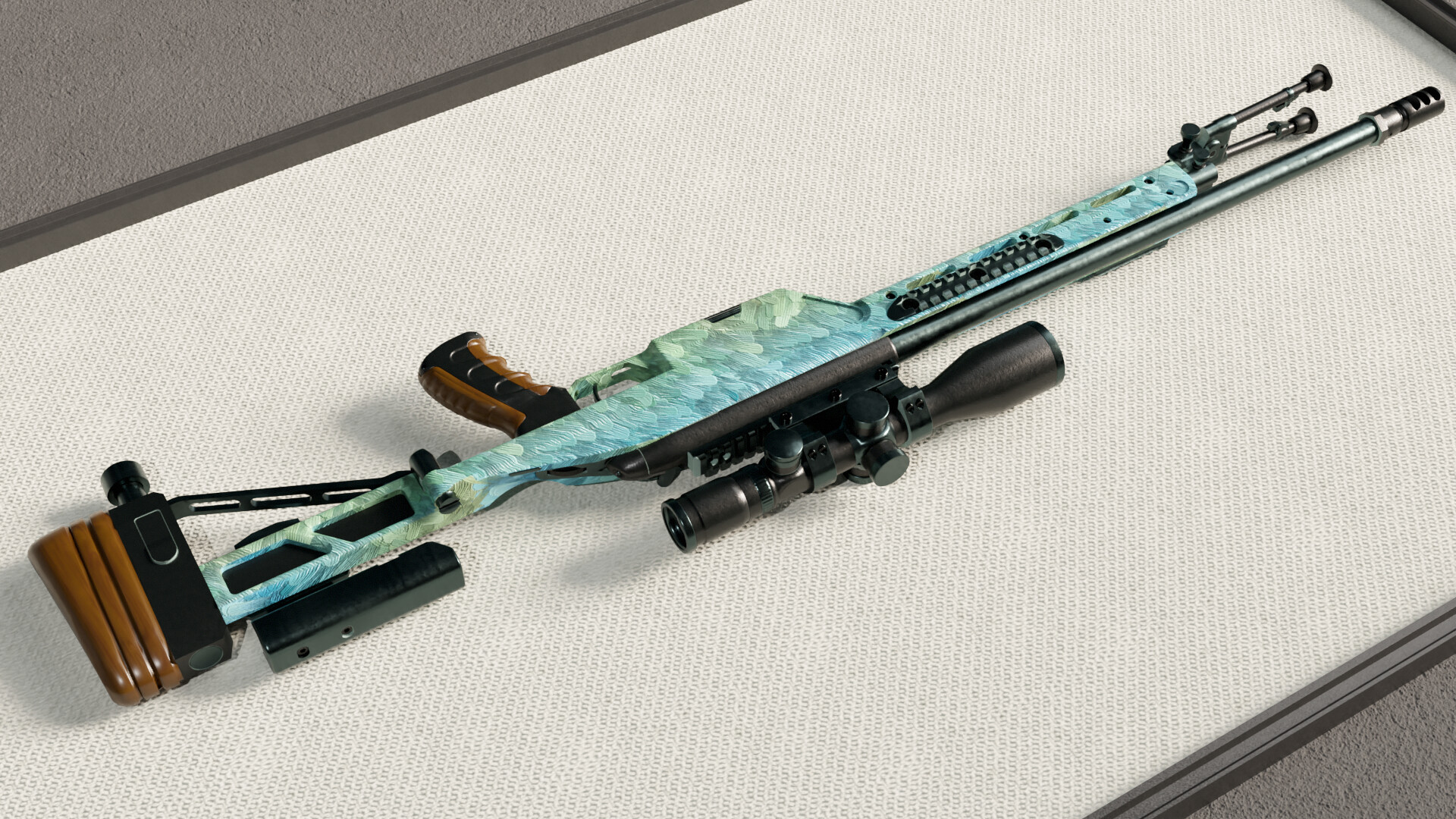 Inspired by the calm clarity of a sunlit shoreline, this SSG 08 features a hand-painted impressionist texture that flows from pale yellow-greens to deeper turquoise blues. The soft gradient evokes the gentle motion of shallow waters, while the black scope and silver barrel maintain a grounded visual balance. Accents in warm wood — on the grip and shoulder pad — frame the piece with an understated, natural elegance.
